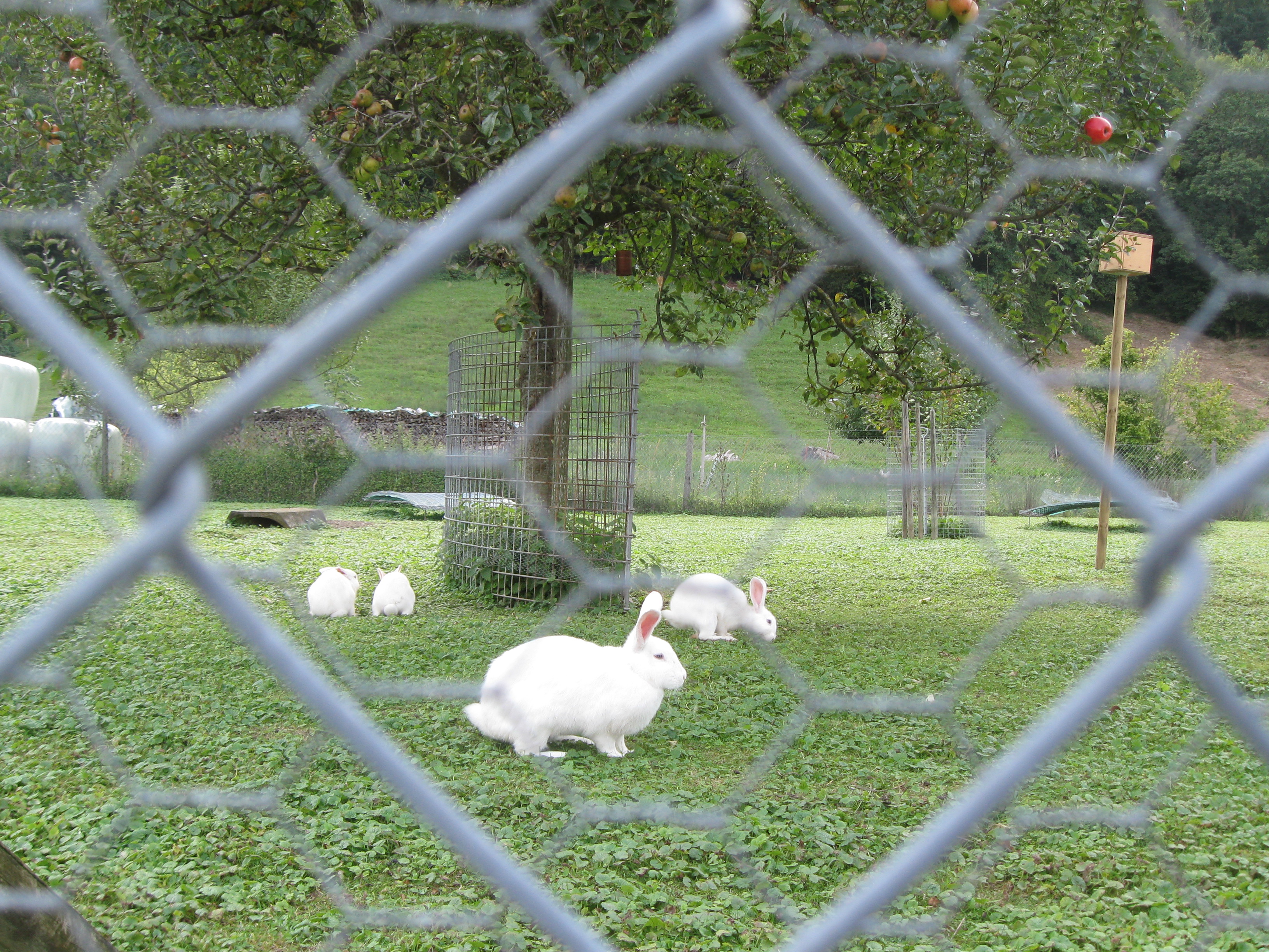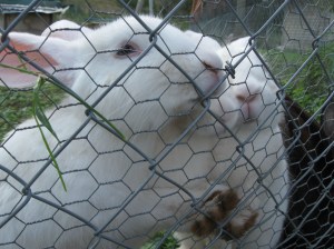 A horrendous scream arose that could be heard from miles away.  Little did Heidi know that it was an electric fence, and by photographing the bunnies, she had put herself in grave danger.  Rubbing her still tingling arm, Heidi carefully stepped back, disappointingly settling for a mediocre, cage-in-the-photo shot (see below).