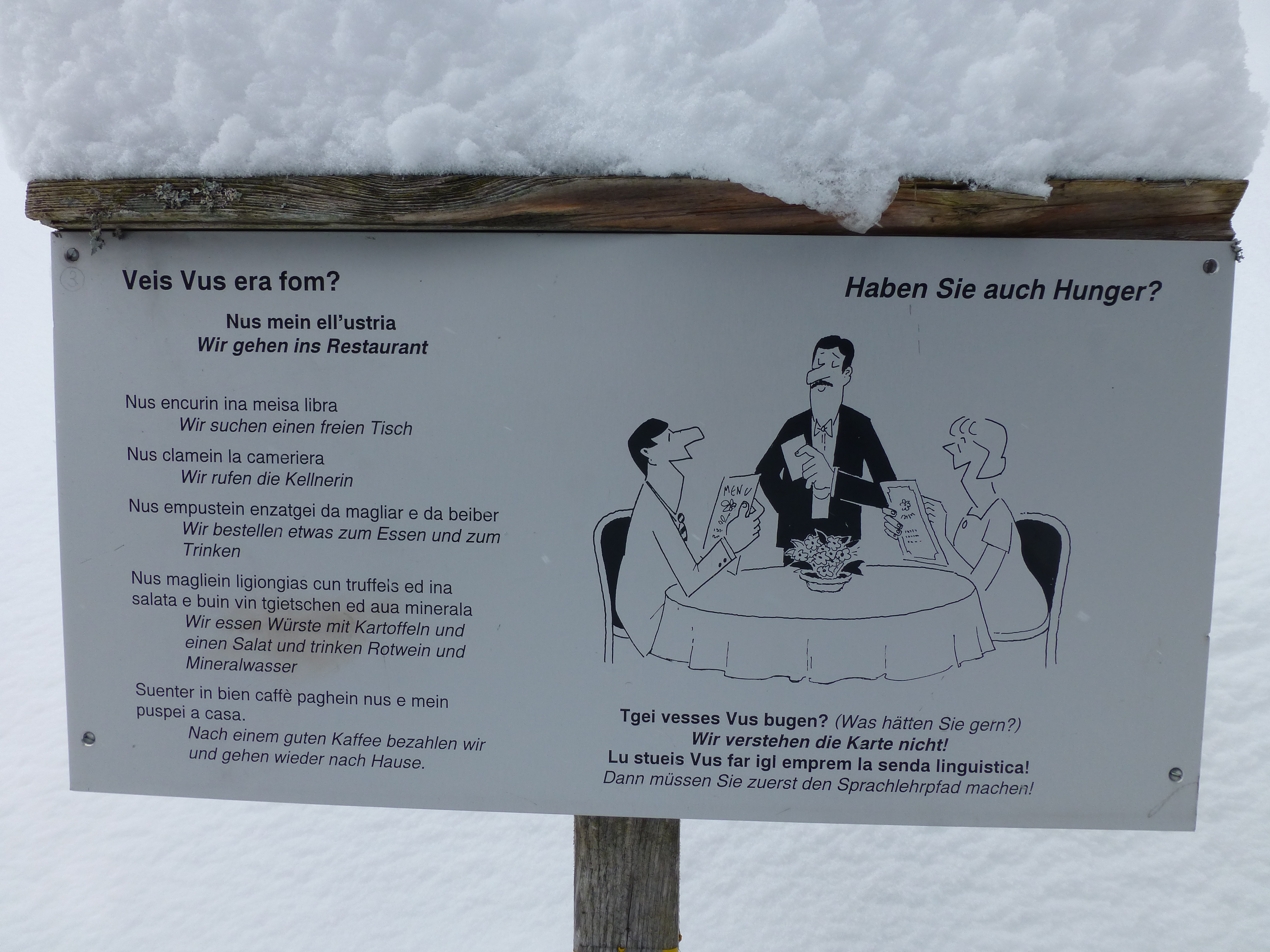 Signs along the Flims hiking trail teaching Romansh (one of Switzerland's 4 official languages)