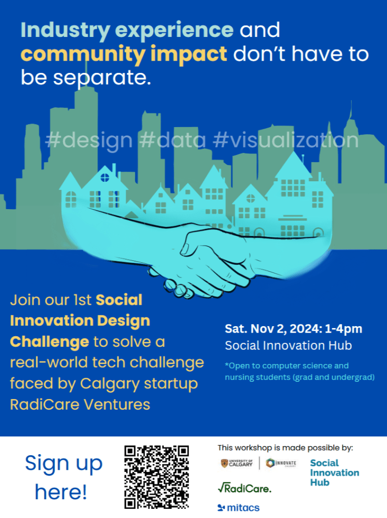 My name is Helen, I’m an assistant professor in the Computer Science department at the University of Calgary. We are hosting a pilot grassroots initiative for a “Social Innovation Design Challenge” in collaboration with the Social Innovation Hub and Mitacs that aims to connect University of Calgary students to the amazing local industry here in Calgary, particularly industry focused on social good and community impact.